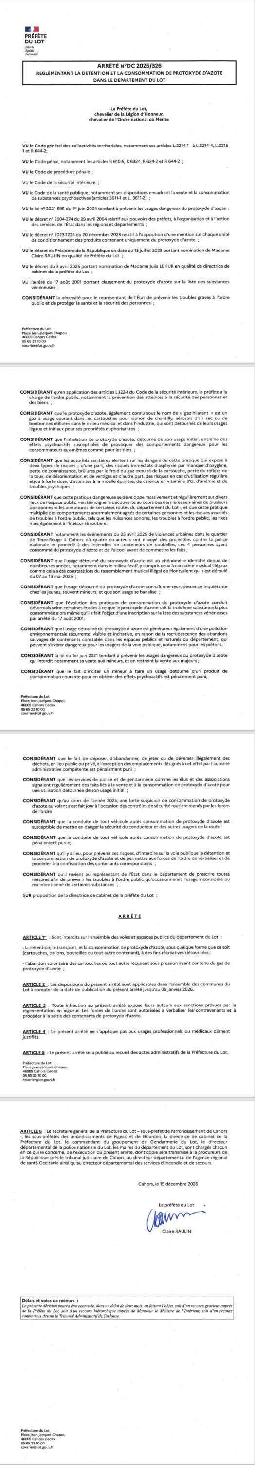 Arrêté n°DC 2025/326 réglementant la détention et la consommation de protoxyde d'azote dans le département du Lot.
