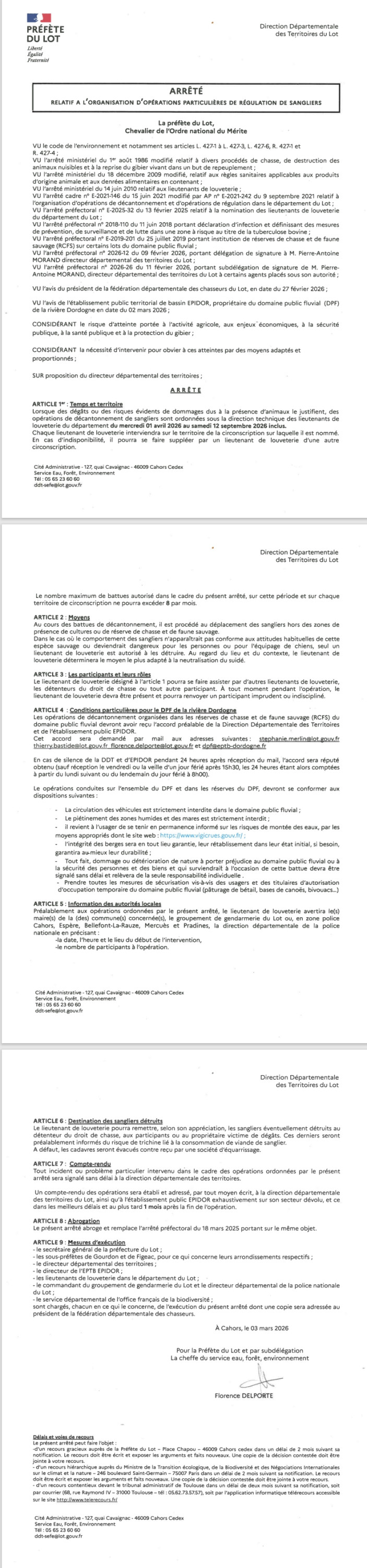AP 2026 relatif au décantonnement de sangliers dans le département du Lot