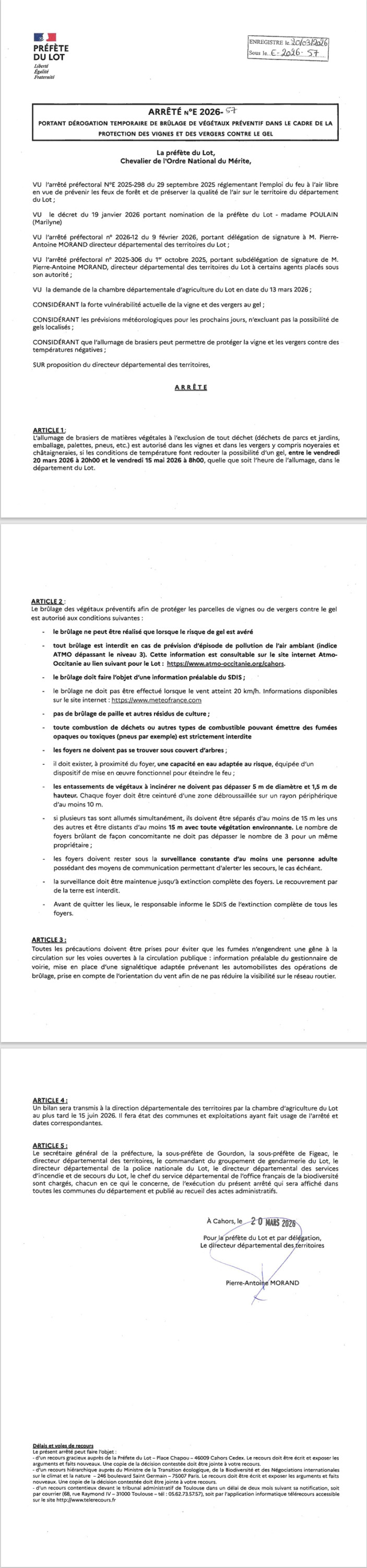 Arrêté préfectoral n° E 2026-57 portant dérogation temporaire au brûlage préventif de végétaux dans le cadre de la protection des vignes et des vergers contre le gel