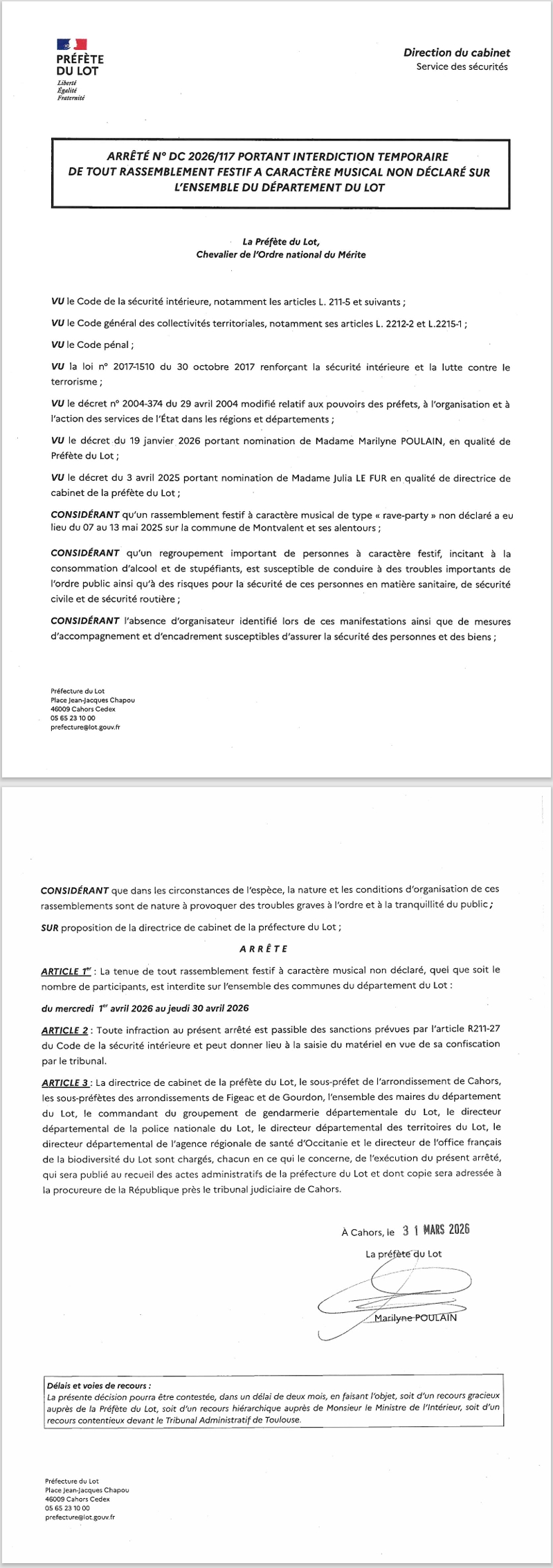 Arrêté portant interdiction temporaire de tout rassemblement festif à caractère musical non déclaré sur l'ensemble du département du Lot - AVRIL 2026